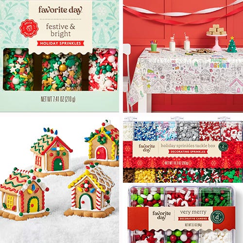 For the cookies, I get everything from Target (truly they have the best options), including this tackle box of sprinkles, these festive sprinkles, and these. I didn’t do it for this party, but I also love the idea of buying these pre-built gingerbread houses, so you can just spend time decorating. I’ve also bought this color-your-own winter village disposable tablecloth several years in a row. I cut/tape it down to our coffee table, and we end up coloring it in all month long. (You need this, trust me. Winter is coming. There is no such thing as too many indoor activities.)