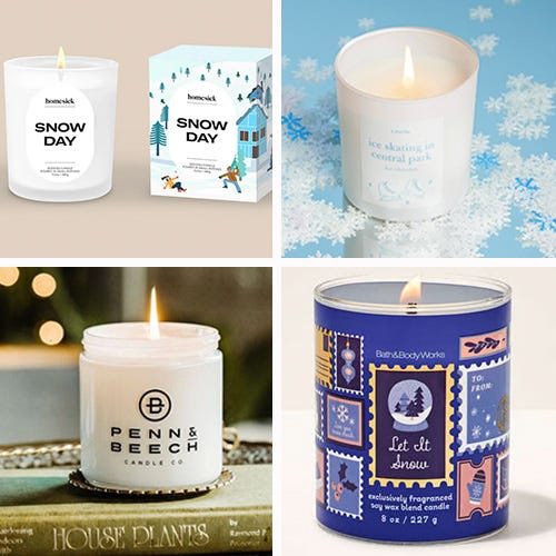 Last weekend we got a very light dusting of ❄️ SNOW!!! ❄️ (gone by 9am, but STILL!). Which means this week’s candles are devoted to that magical, mystical feeling that arrives when it snows in December. In selecting these I looked for crisp, fresh top notes, floral, mint, vanilla, eucalyptus, and just a hint of cedar or musk. Try: